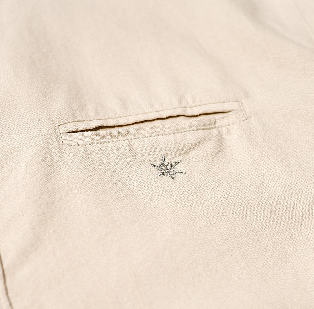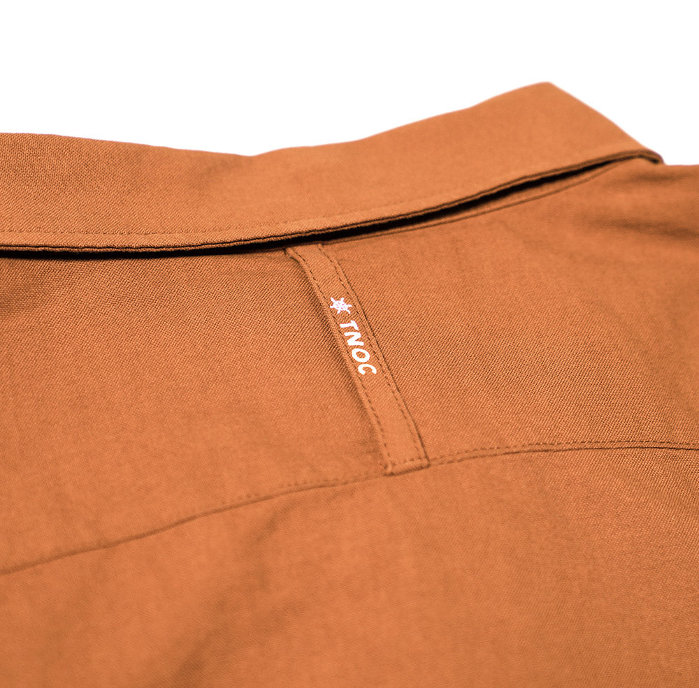 タックアウトスタイルにすると、動きによってパラシュートボタンの裾にとりつけたTNOCのネームが見えるのもポイント。