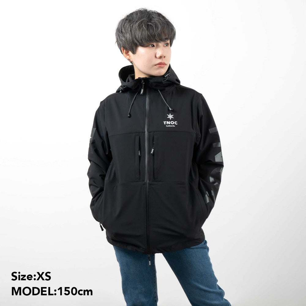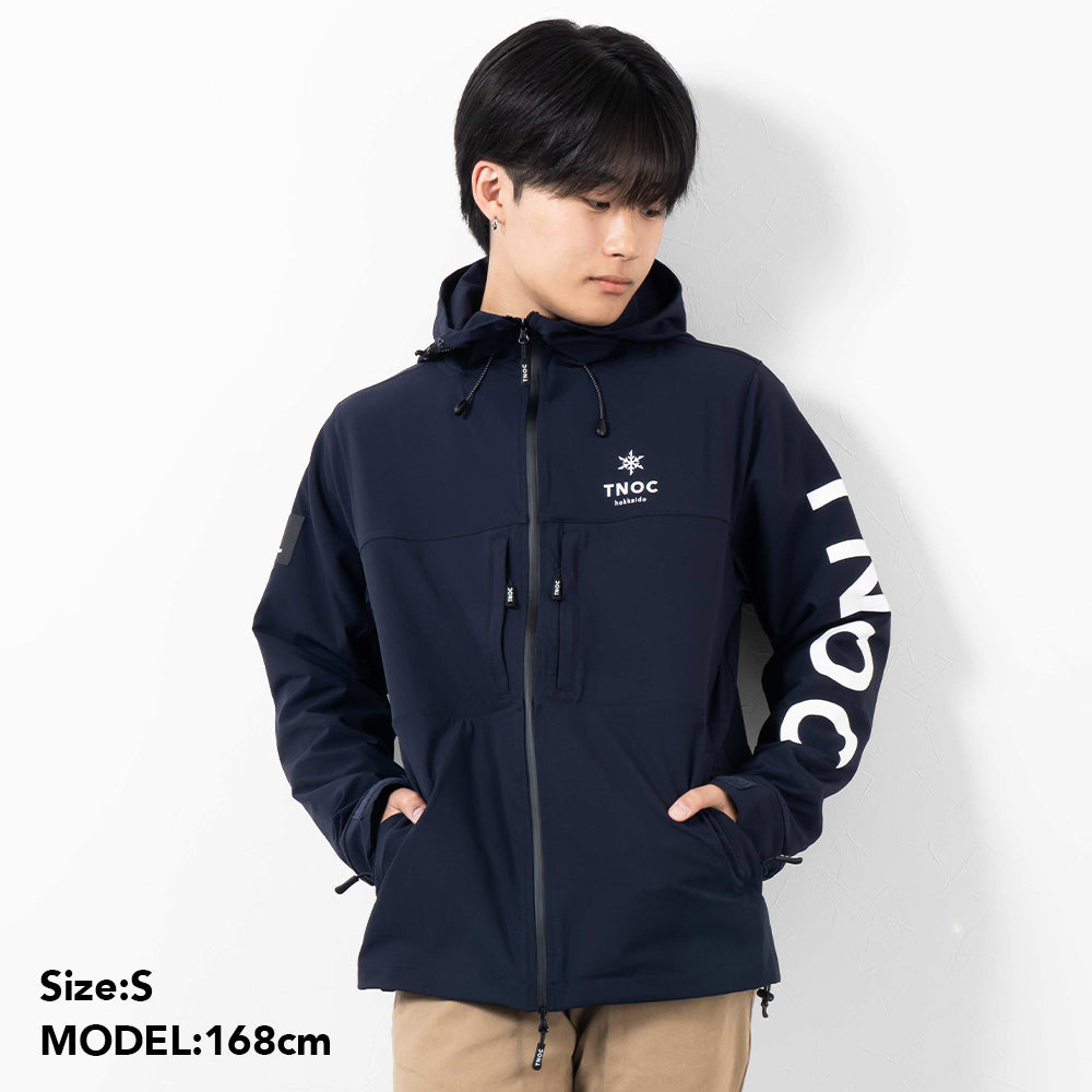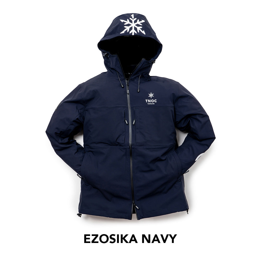 TNOCの定番カラーEZOSIKA NAVYはソリッドカラーに。定番のカラーは、使うシーンを問いません。フードや袖のプリントはホワイトにして、北海道デザインを前面に押し出しました。 TNOC hokkaido好きなあなたにぜひオススメしたいカラーです。