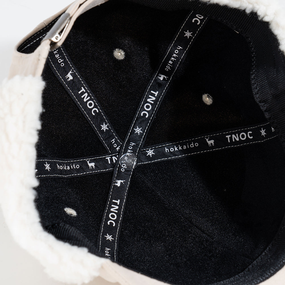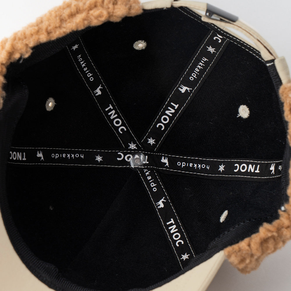 内側のテープにも注目して。こだわりのTNOC hokkaidoのロゴとエゾシカのシルエットテープが、被るときから気分を上げてくれます。イヤーフラップはサッと上でとめたり外したりしやすいベルクロ付のテープ。雪が降ってきた時はアゴの下でしっかりとホールドさせることができます。