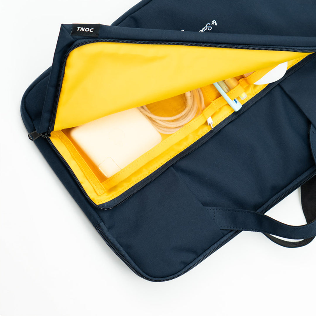 ジップを開くと鮮やかなイエローが目に入り、奥まで見やすいのでケーブルなどの小物も取り出しやすいのが魅力です。ぜひ次のビジネスシーンでどうぞ。