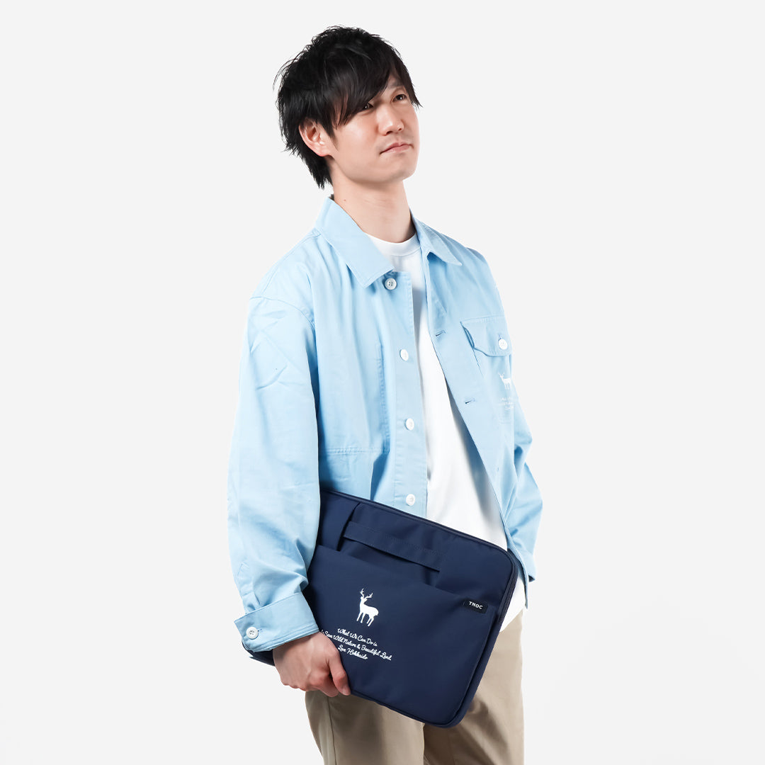 また、フロントにはジップ付きのポケットを配置。3つのスリットが、マウスやボールペン、ACアダプタやケーブルなど、必要なアイテムをコンパクトに整理して持ち運ぶことができます。さらにベルトをさっと引き出せば、トートバッグのハンドルとしてお使いいただけるスタイルに!