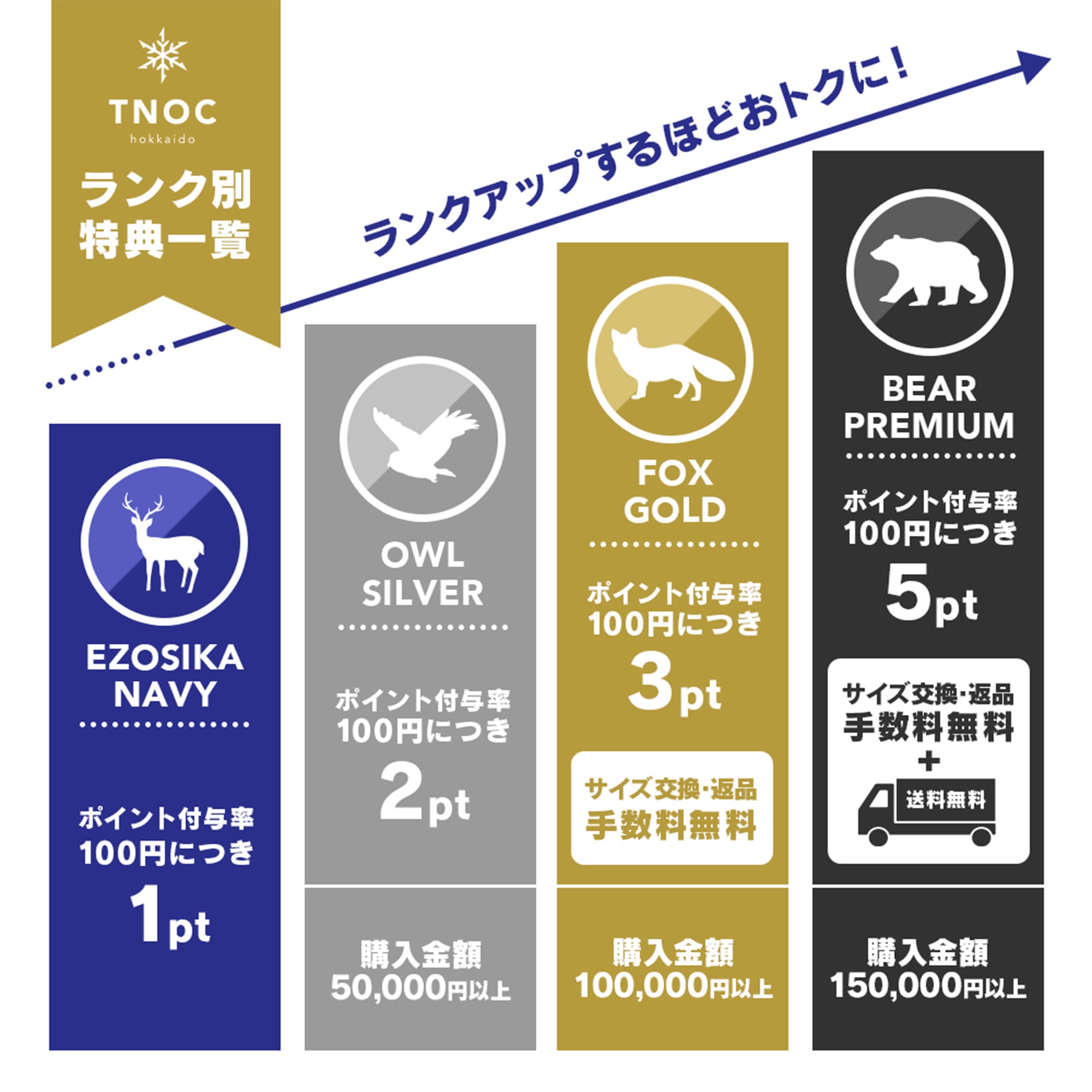 TNOC POINTを貯めれば貯めるほどうれしい。たくさんお買い物していただくことによってランクがアップします。ランクアップするとポイント還元率がアップしたり送料が無料になる、先行販売や特別なセールにご招待するなどうれしい特典がいっぱいです。