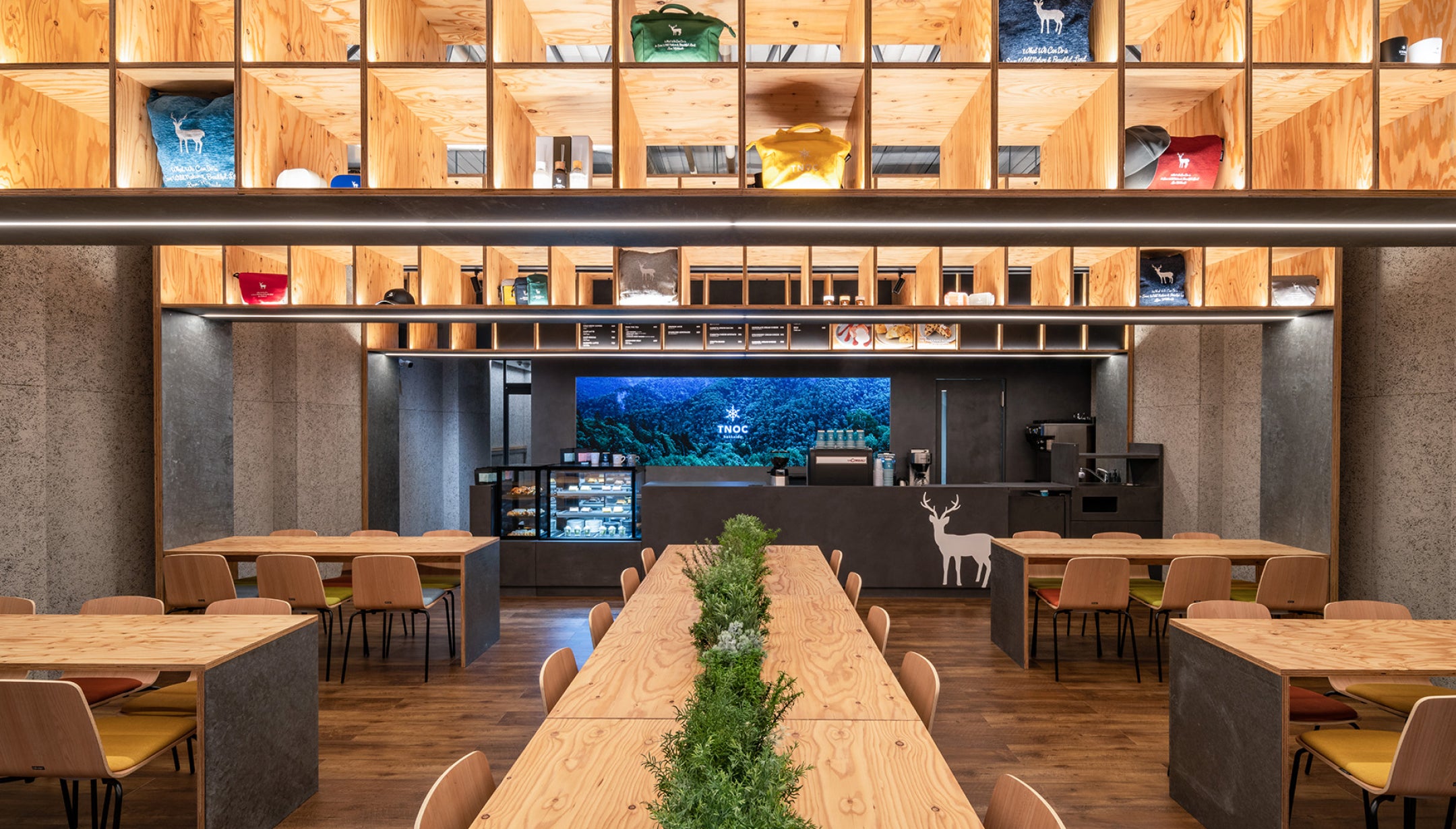エントランスは北海道の針葉樹林と真っ白なエゾシカがお出迎え。 店内に入ると、まるで北海道の森に迷い込んだような北海道産の木材をふんだんに使った5つのゲートと北海道の自然を映し出すLED、オリジナルのアロマがあなたを迎え入れてくれます。