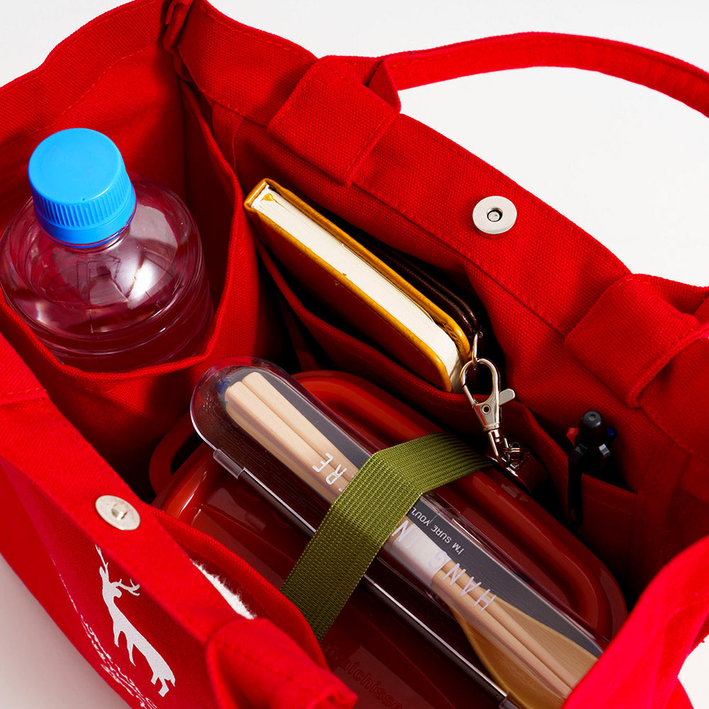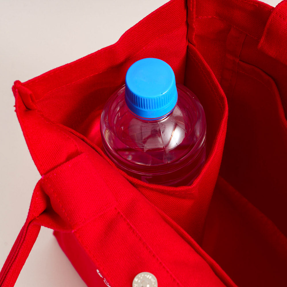 このサイズのトートには珍しい数多くのポケット。水筒やペットボトルが入るボトルホルダーはメインポケット内部に。数々のアイデアを詰め込みました。