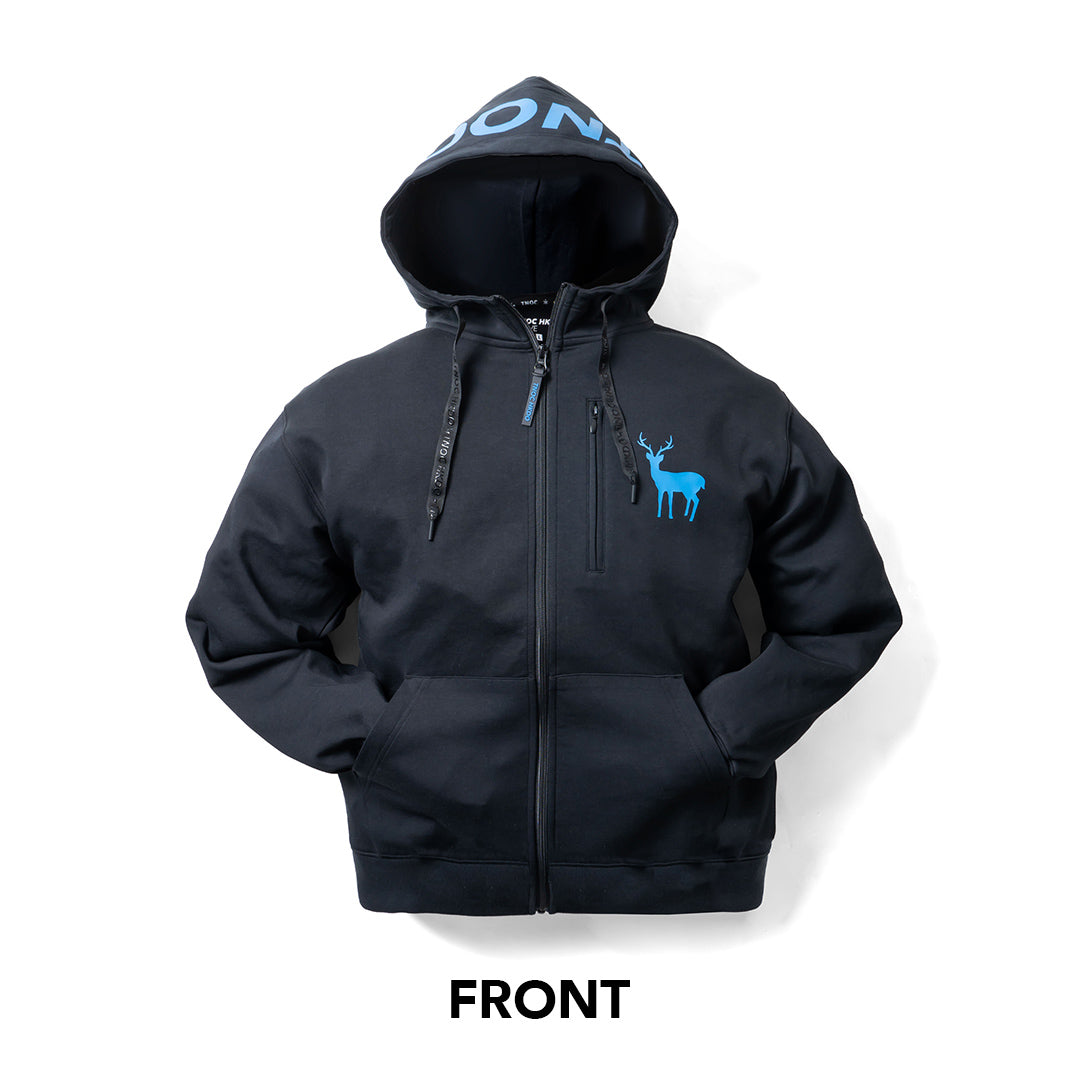 フーディーにプリントされた大胆なTNOCのロゴと、背中の「FIGHTERS」の文字のバランスの良さにもこだわりました。 フードコードにもロゴをさりげなく同色でプリント。動くたびに光が反射する演出に。