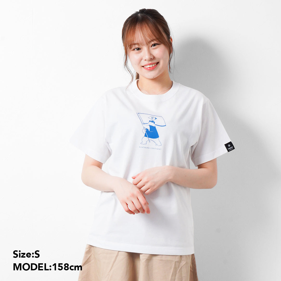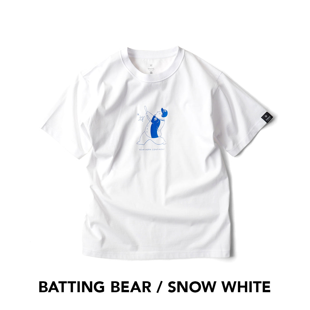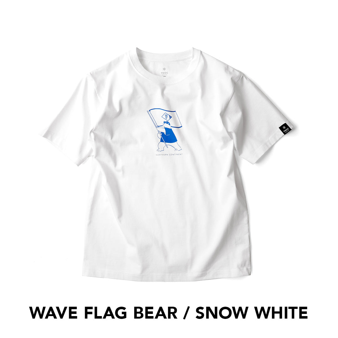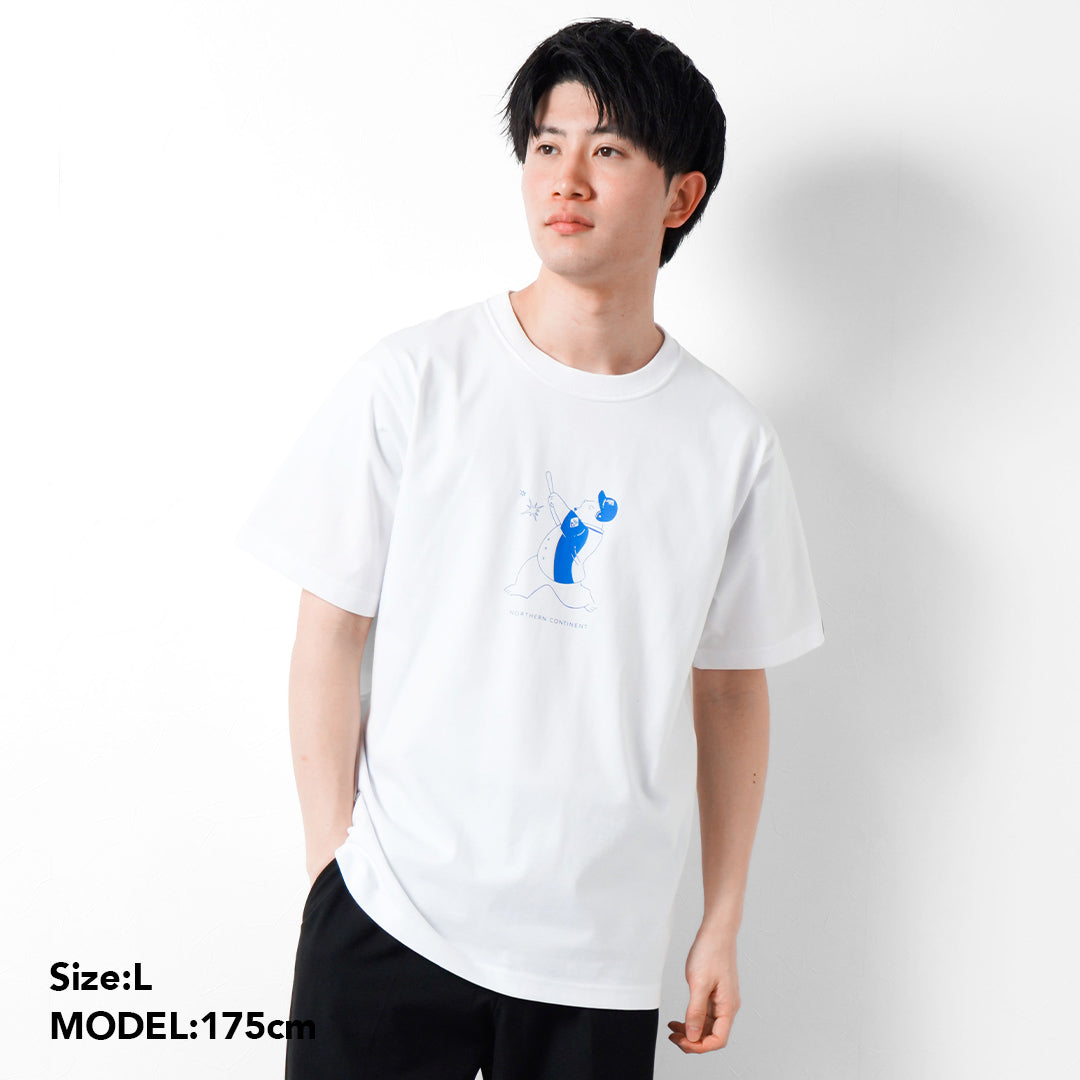 大きく旗を振って応援するクマを描きました。試合観戦時はもちろん、ふだん使いとしてもぴったりの、遊び心のあるTシャツです。