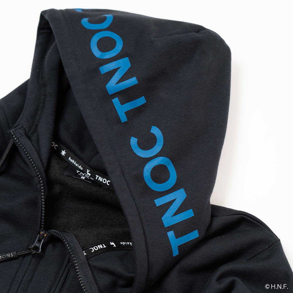 襟の立つフードは、ジップを開けても閉めてもカッコイイ。ドローコードはカラーによって異なるのもポイント。コードエンドはそれぞれのボディーカラーをセレクト。TNOCの刻印を見逃さないで。ジップの引き手も掴みやすく滑りづらいパーツを。こちらにも立体的なTNOCの刻印がカッコイイ。裾のポケットにも中身が落ちないようにジップを付けました。フードには、TNOCのロゴをVer.2に比べてシンプルにプリント。絶妙なバランスをどうぞ。
