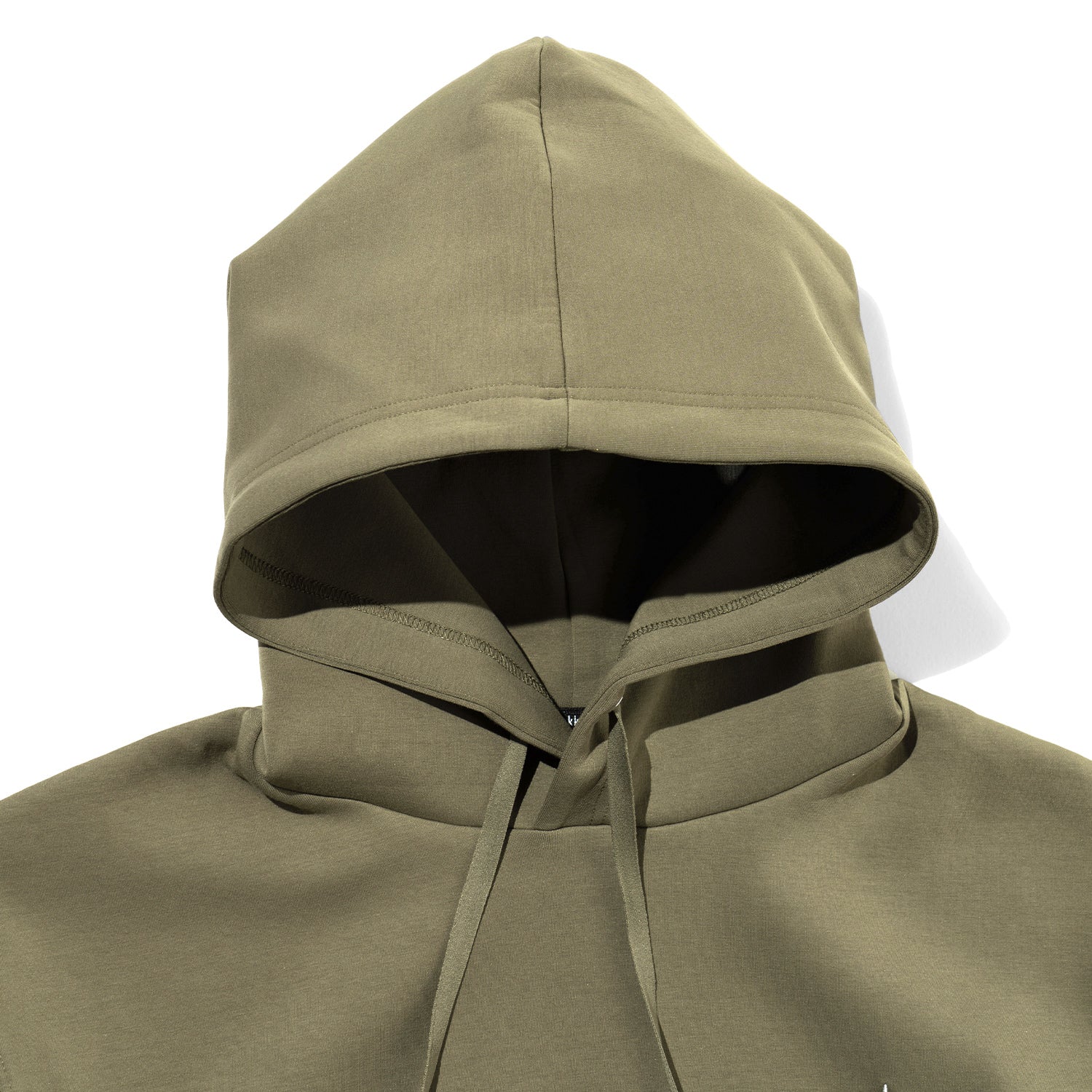 シワになりにくく、ゆるやかにドレープをみせてくれる質感はプルオーバーパーカーのフードや首元を立体的に見せてくれます。