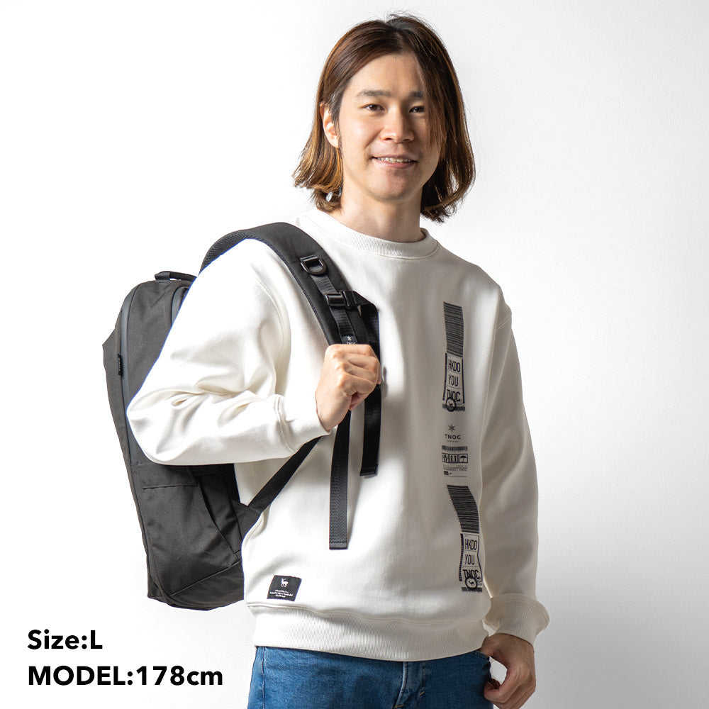 厚すぎない生地感は、春や秋の肌寒い時のアウターとしてはもちろん、クルーネックなのでフーディー付のフリースやダウンジャケットとあわせても、すっきりとしたコーディネートを楽しむことができます。