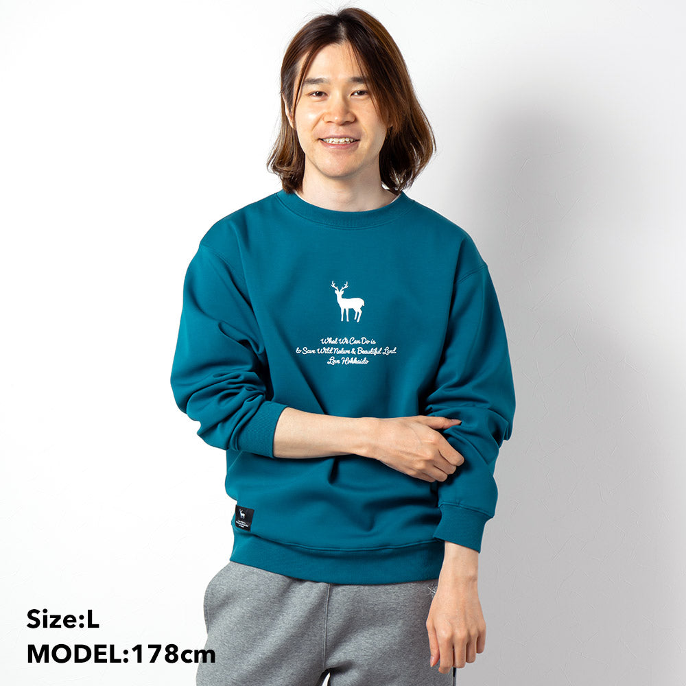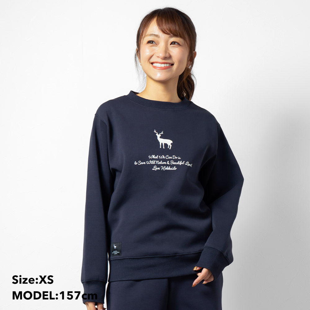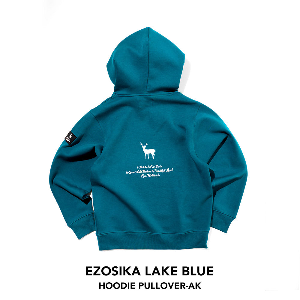 湖をイメージしたLAKE BLUEは落ち着いた色でカジュアルなのに上品な雰囲気も出してくれます。胸元の雪の結晶の刺繍とバックプリントのエゾシカがかわいいアクセントに。
