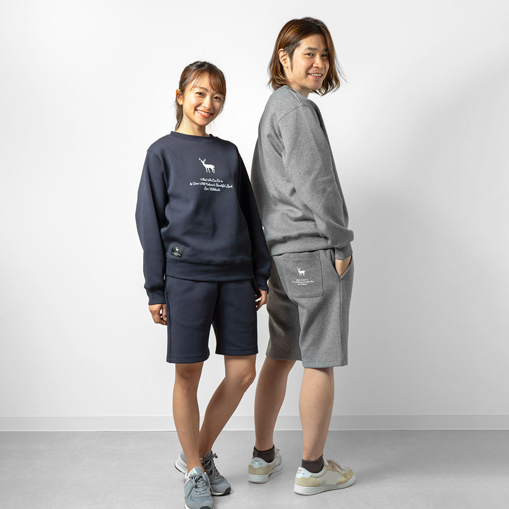 あなたが動くたびにトップスの裾からチラリと見えるエゾシカがかわいい。シワになりにくく、ゆるやかにドレープをみせてくれる質感はエアーニットならでは。ショーツの丈はちょうど膝くらいの長さにして、幅広い方に楽しんでいただけるようにしました。着心地が良いのでルームウェアとしてもぴったりです。マットなテクスチャ、そして動きやすさをお楽しみください。