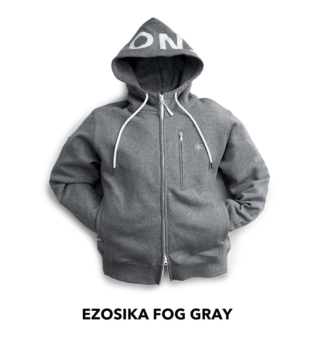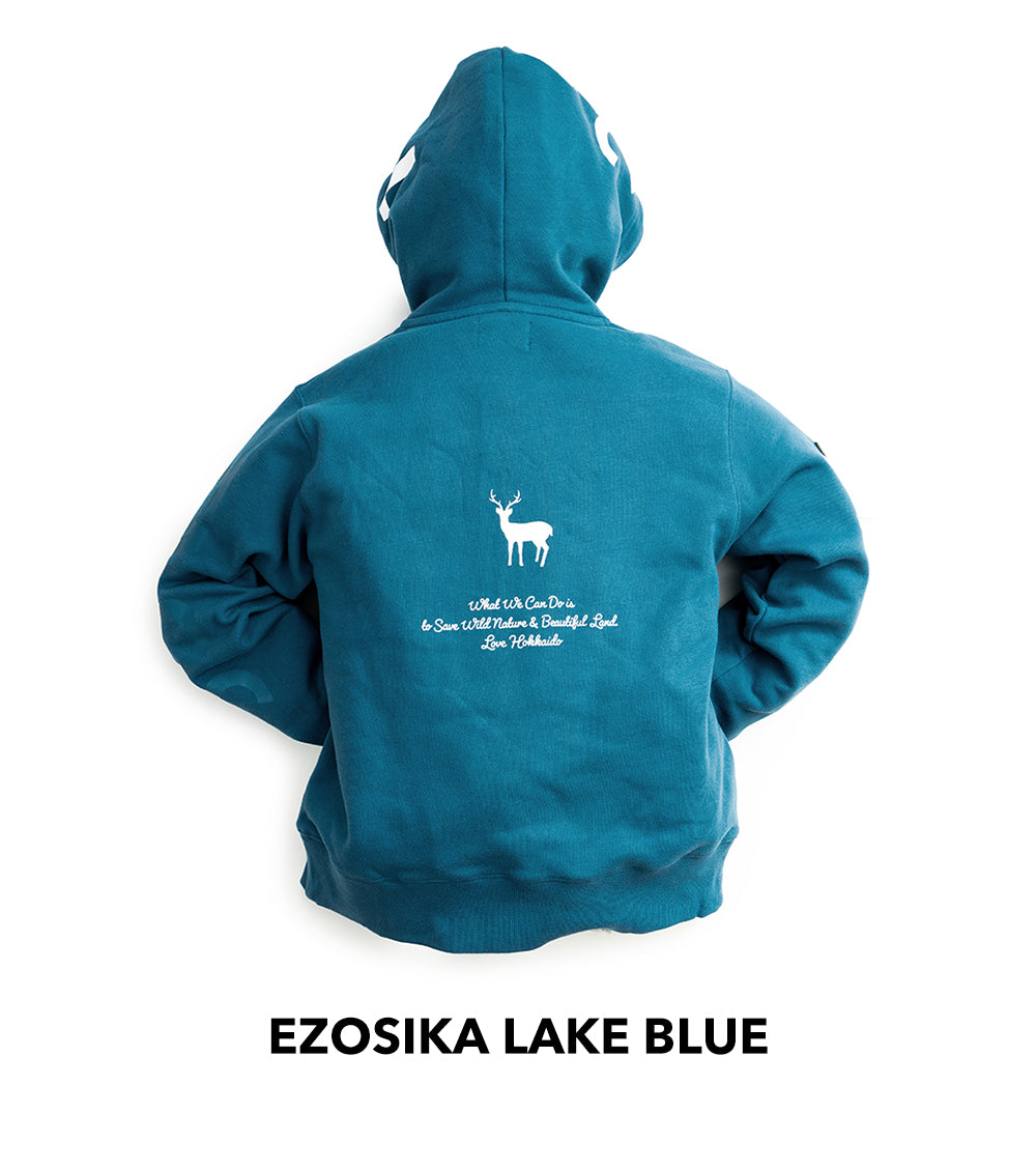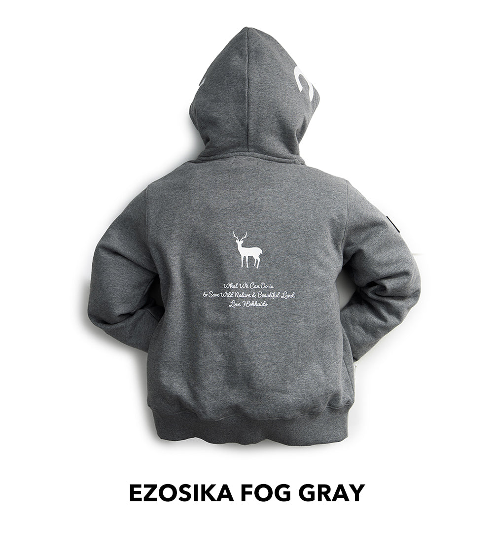 バックプリントにエゾシカのシルエットが描かれたモデルは、コーディネートしやすいFOG GRAYと、差し色として映えるLAKE BLUEを。