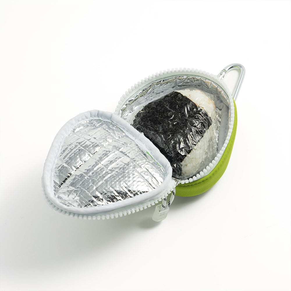 おにぎり1個がぴったり入る形。バッグの中でつぶれやすいおにぎりをエキストラポケットで外出しして。