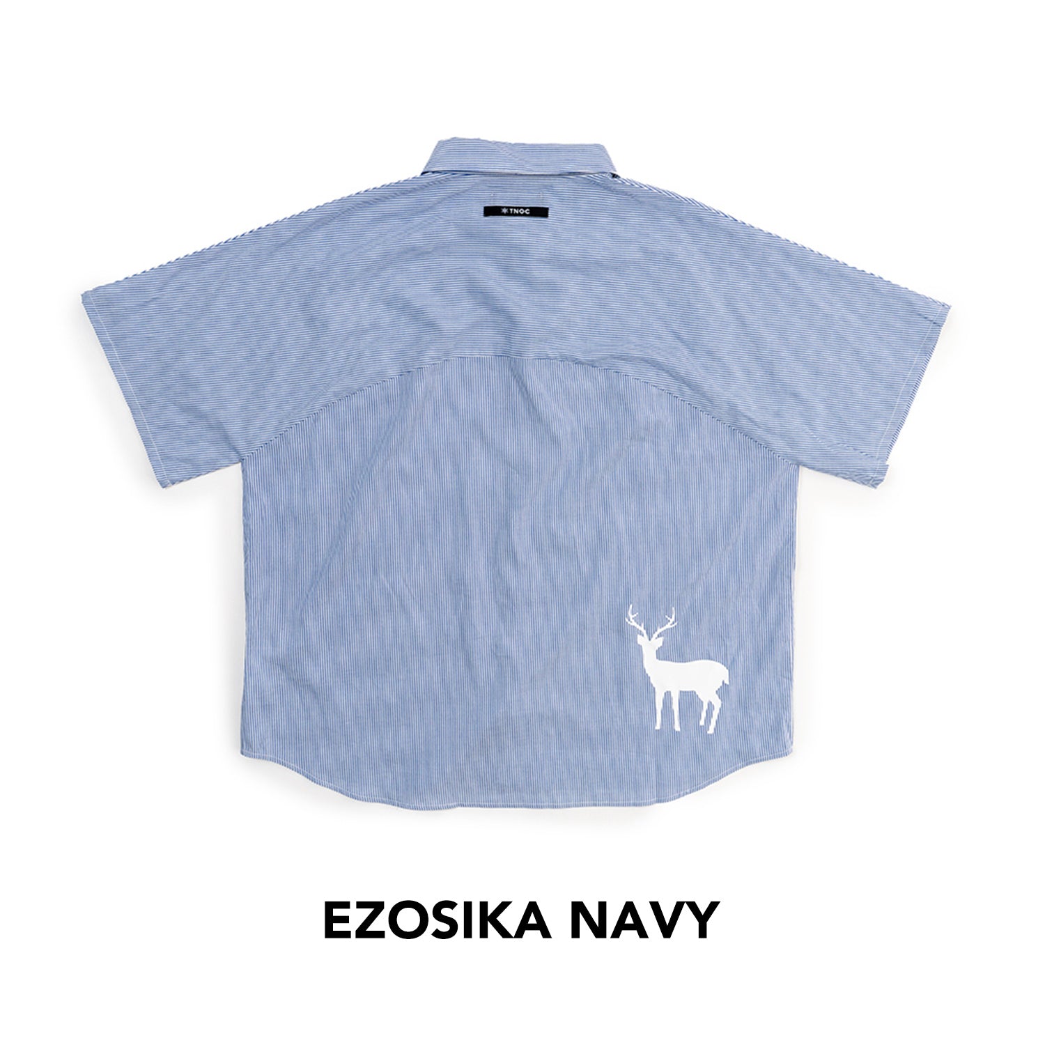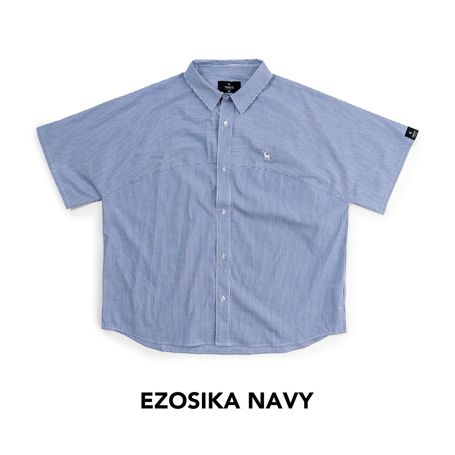 少し明るめのネイビーのストライプ。幅広い年齢の方に楽しんでいただけるカラーです。 胸元にはエゾシカの刺繍を。ホワイトのパンツやスカート、ネイビーのキャップ、スニーカーと合わせて爽やかに。