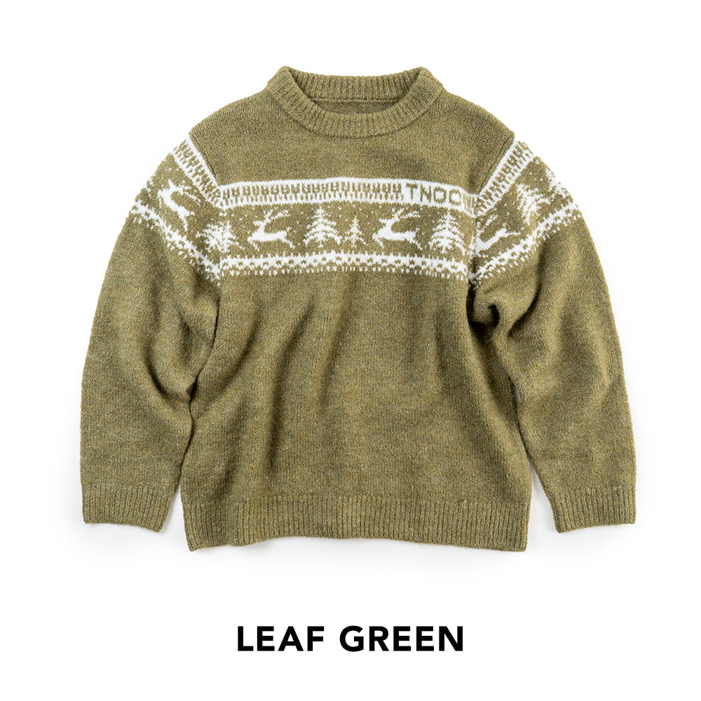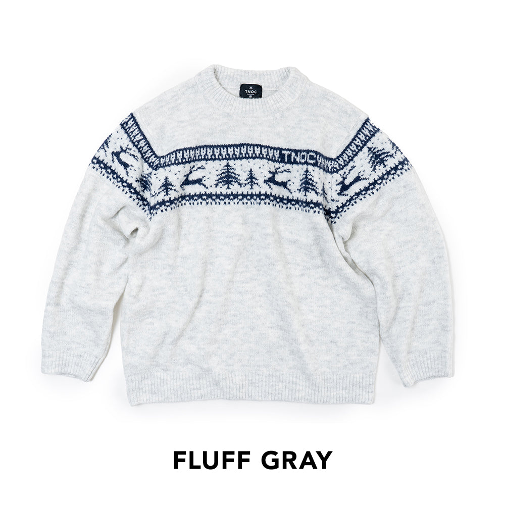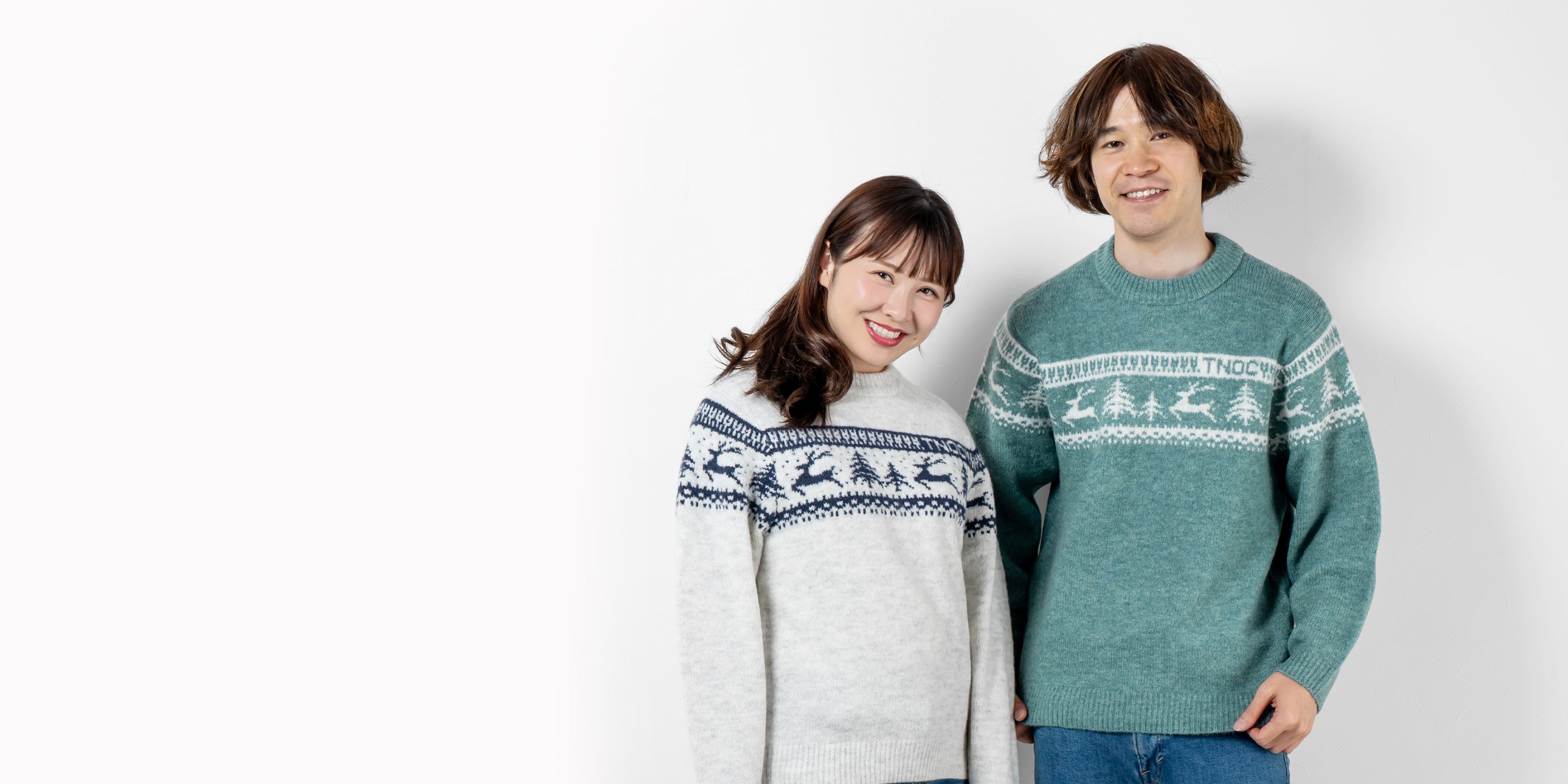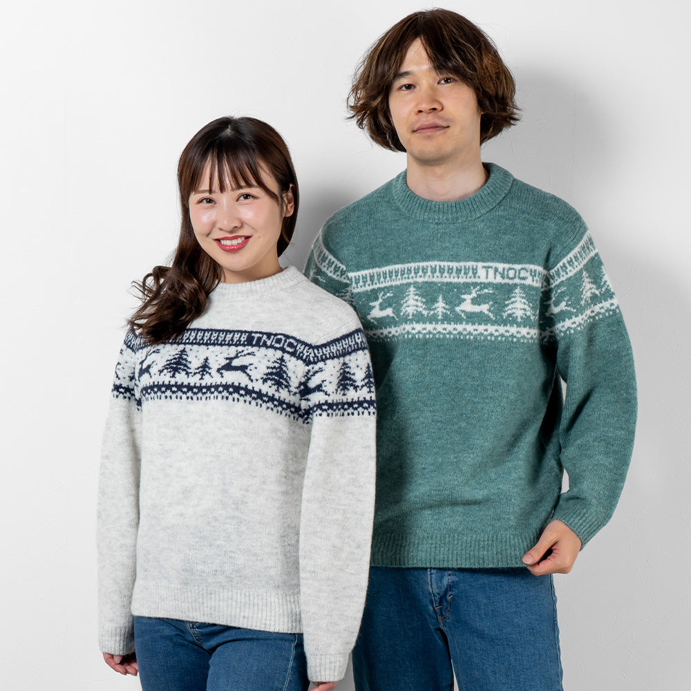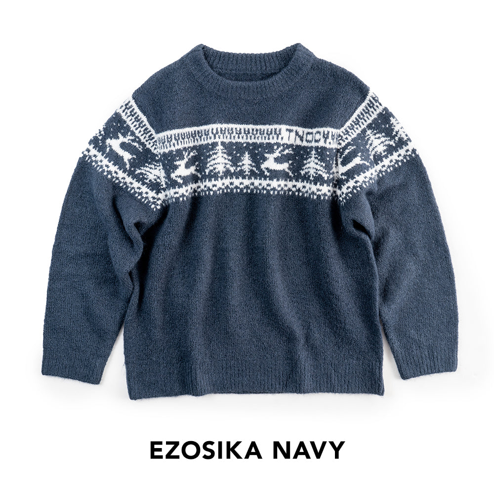 Introducing the refreshed TNOC classic sweater, now featuring an enchanting design inspired by Ezo deer, Ezo pine trees, and softly falling snow.