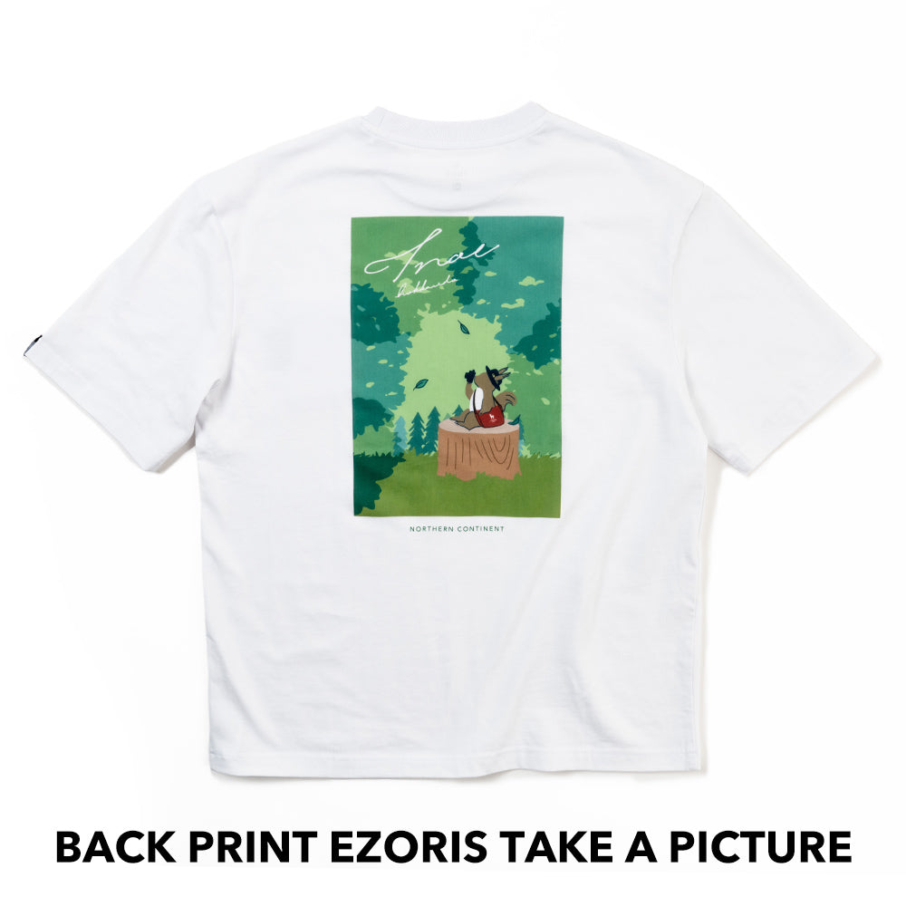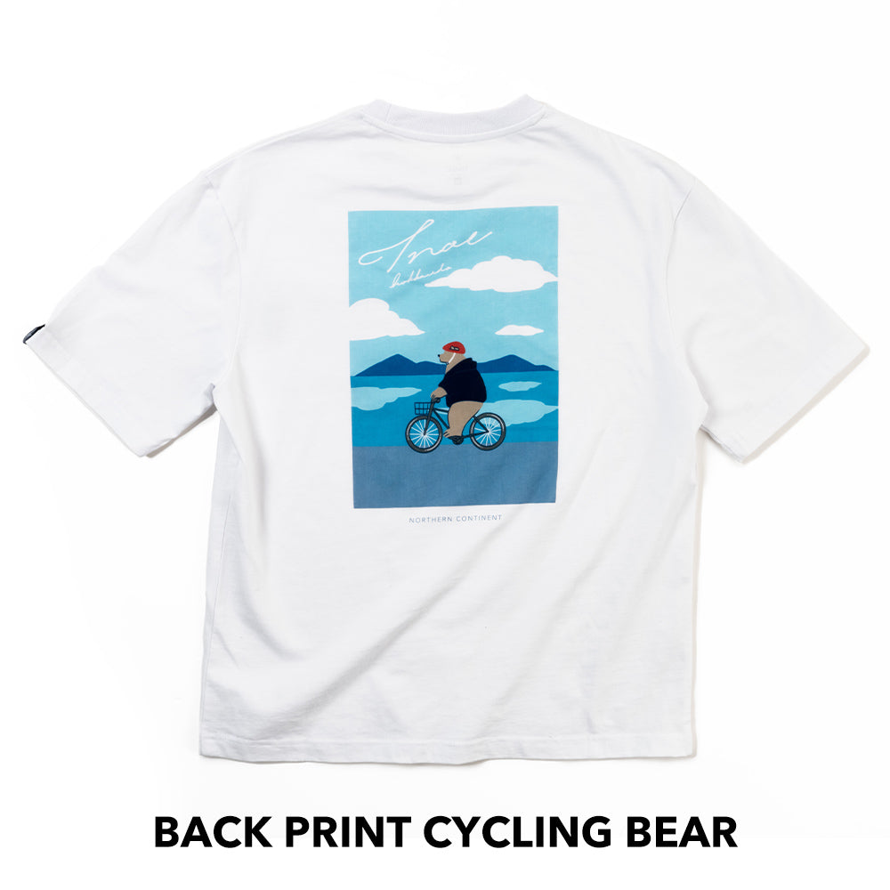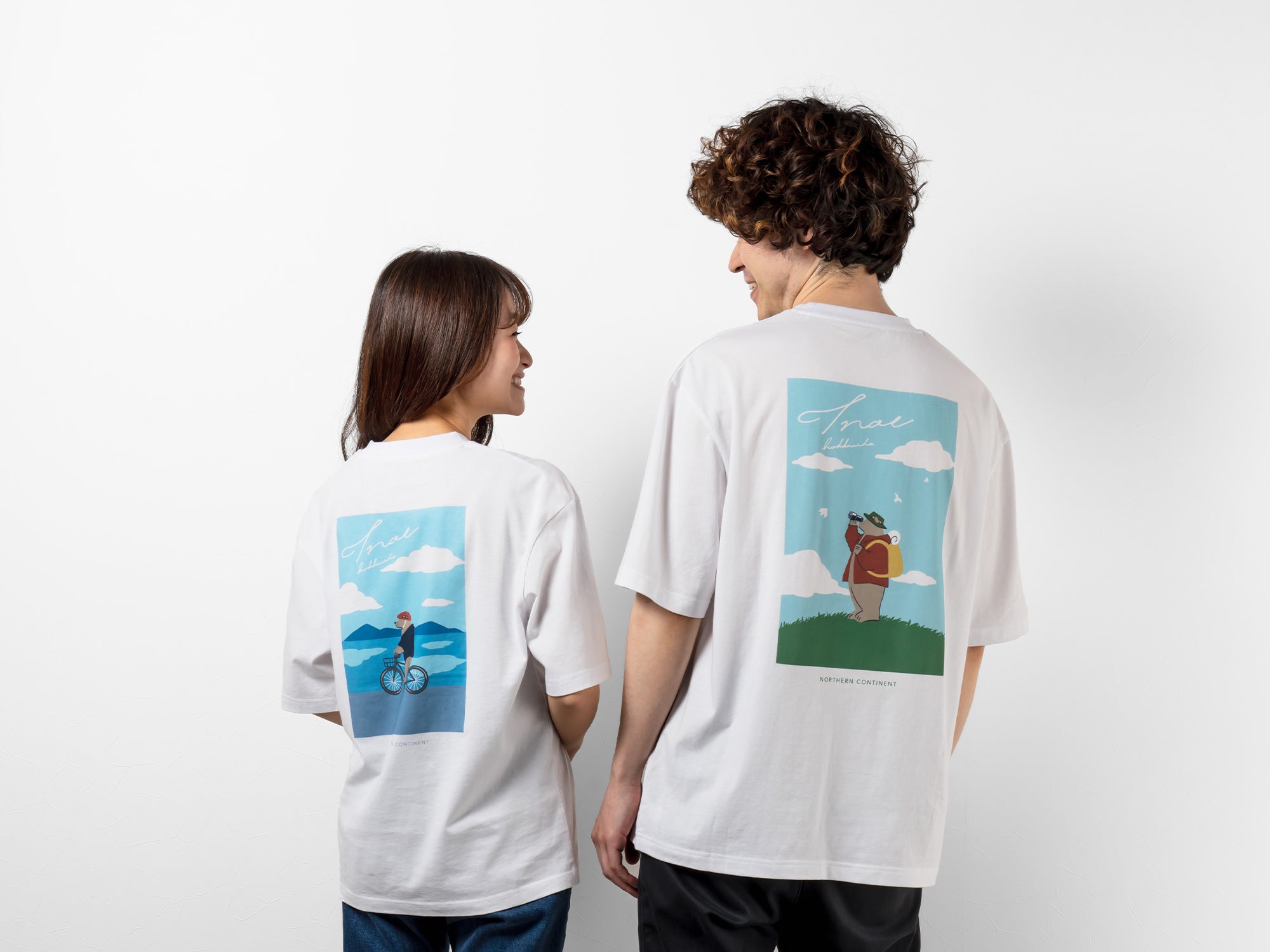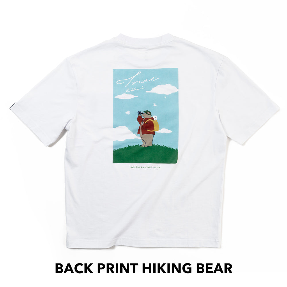 そしてバックプリントには北海道の自然の中でハイキングを楽しむクマを描いたイラストを大きくプリント。