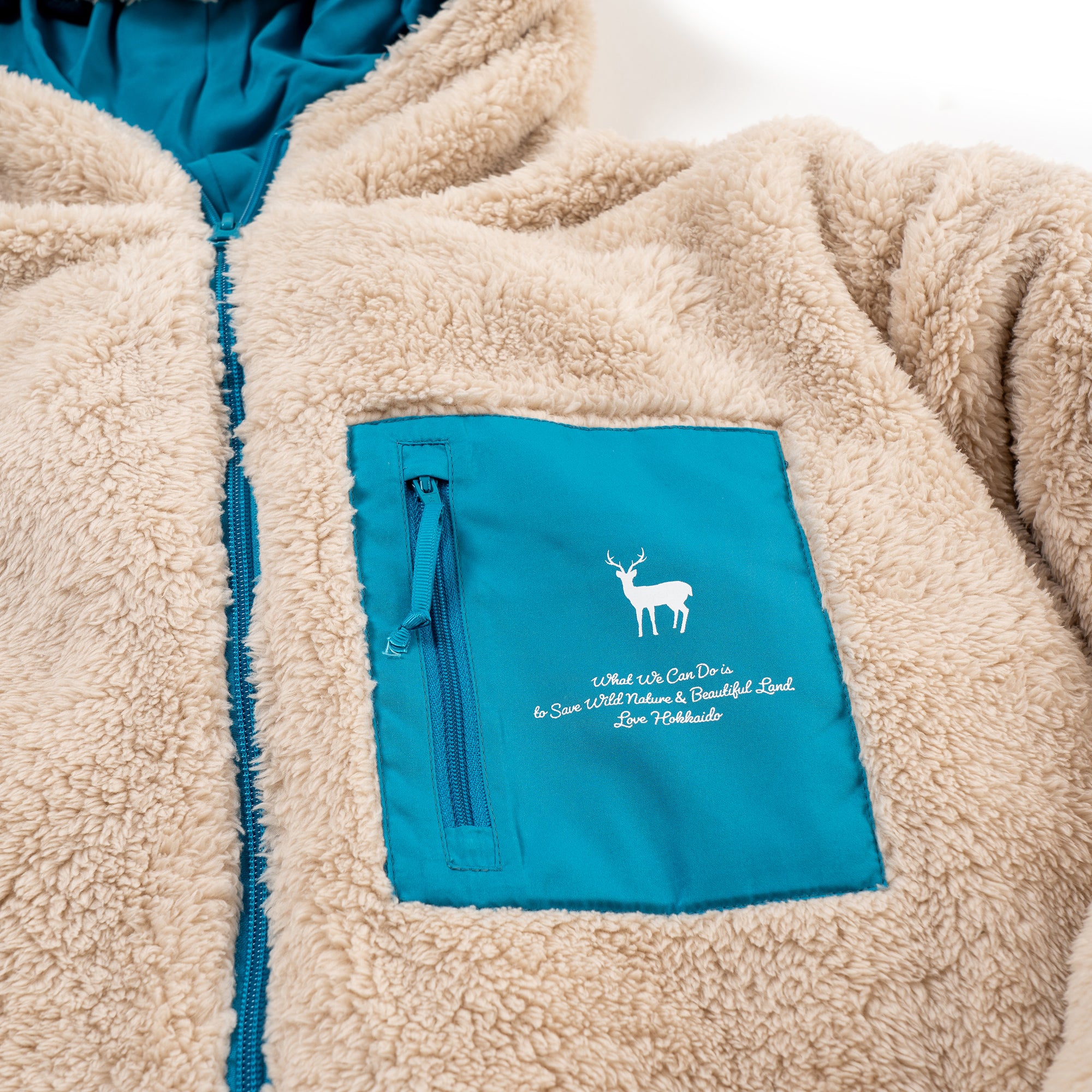 あたたかみのあるホワイトのフリースをベースに、やさしいアースカラーのグリーンをパイピングと胸ポケットに。