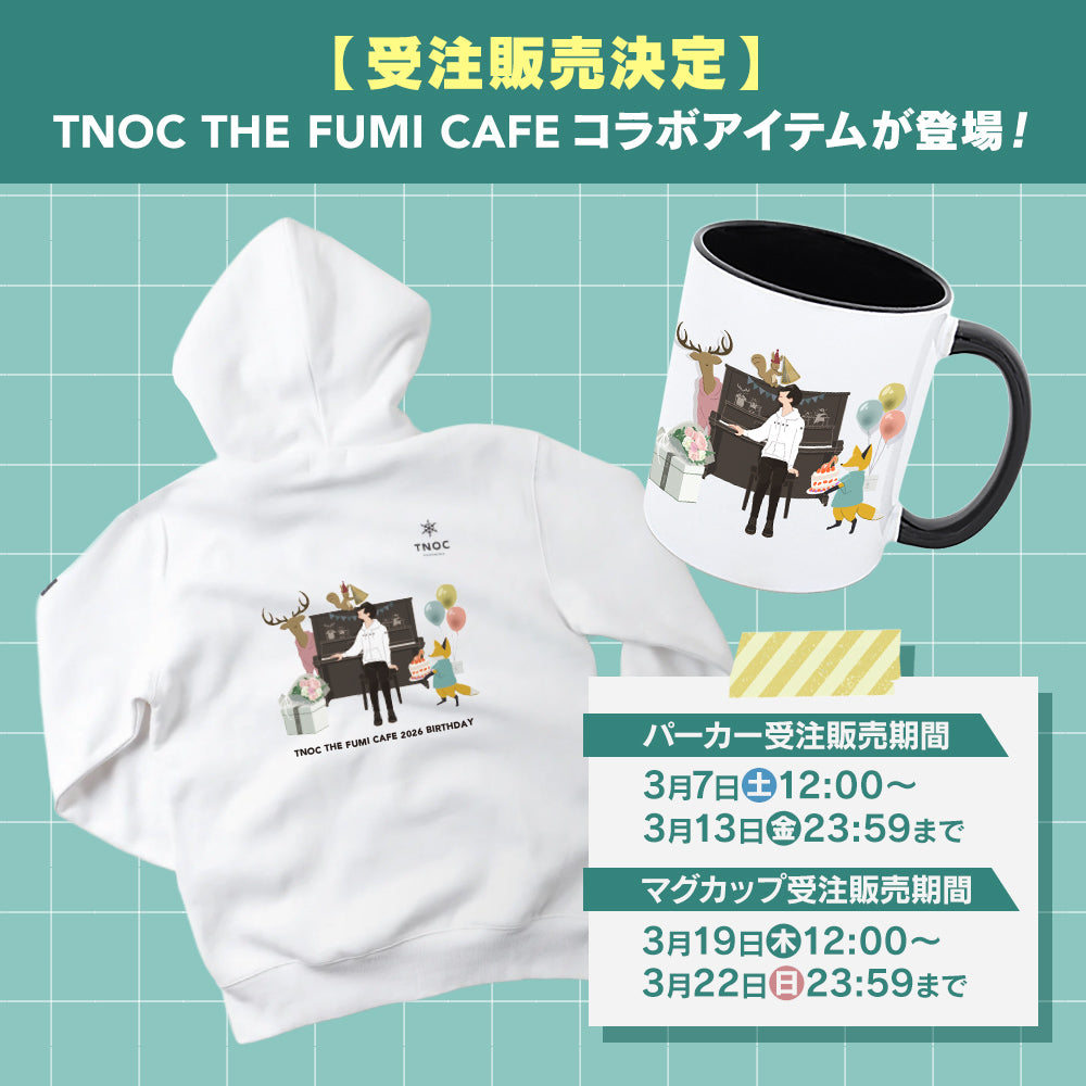 ※画像はイメージです。5月24日にTNOC THE CAFE SAPPORO T4で行われるピアニストふみさんとのコラボイベント「TNOC THE FUMI CAFE 2026 BIRTHDAY」のコラボパーカーとマグカップの受注販売が決定しました!
