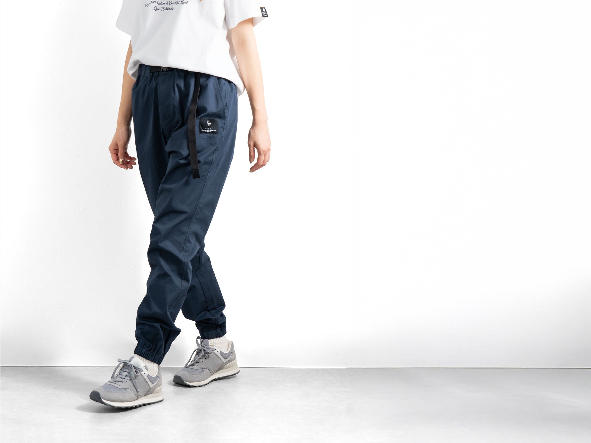 ベルトコードの先のTNOC hokkaidoのネームが、歩くたびに揺れてさりげないアクセントに。